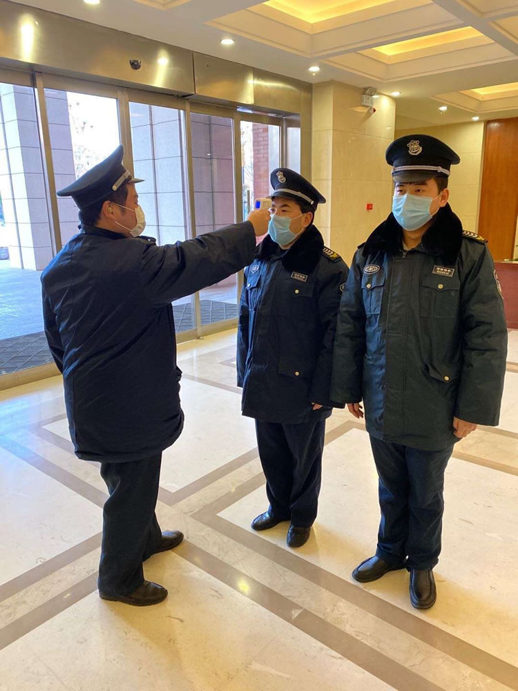 1、駐市委市政府崗點的保安員們,精準實測,科學防控。綜合辦公區(qū)、人大、政協(xié)等崗位每天堅持對全員進行崗前動員、疫情防控知識培訓,重點部位嚴格檢查等工作部署。在安保消防工作中:做到消防安全標準不降低,以“防消結合”為目標,人防技防相結合,加大巡查力度,堅決預防火災事故發(fā)生;消控室值班人員堅守崗位,做到遇有突發(fā)事件及時上報及時處理。各門崗及崗點安保工作:由于來往市委、市政府辦公的人員涉及各個行業(yè)和不同領域,人員眾多、成分復雜,疫情傳染幾率高,工作任務重。但這些困難和問題沒有讓這里的保安隊員們畏懼和退縮,反而,職業(yè)的責任感和光榮感,使他們增加了戰(zhàn)勝困難的決心和信心。隊員每天7點到21點超長堅持工作,一方面堅持對值班室及防控區(qū)域的消毒,自身防護,同時堅持對進入的車輛和人員消毒、登記、體溫測量、查驗證件等工作,科學防控。疫情期間,無論疫情與天氣,堅持每日按時升掛國旗,展示了機關大院的良好形象。