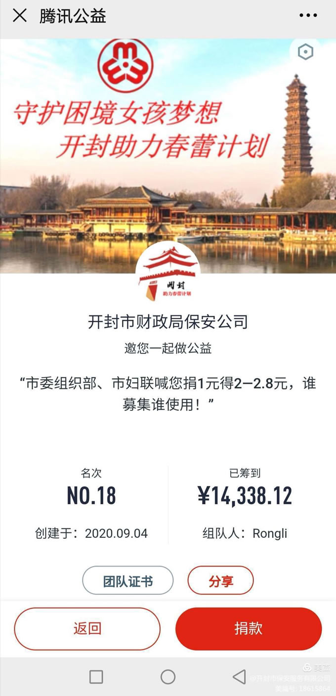 99公益日“春蕾計(jì)劃”項(xiàng)目網(wǎng)絡(luò)募捐籌款活動(dòng)開(kāi)展以來(lái),公司全體人員積極參與,大力支持。公司助力春蕾計(jì)劃戰(zhàn)隊(duì)873人次參與捐款,自籌資金14338.12元,位居全市參與1602個(gè)團(tuán)隊(duì)的第18名。