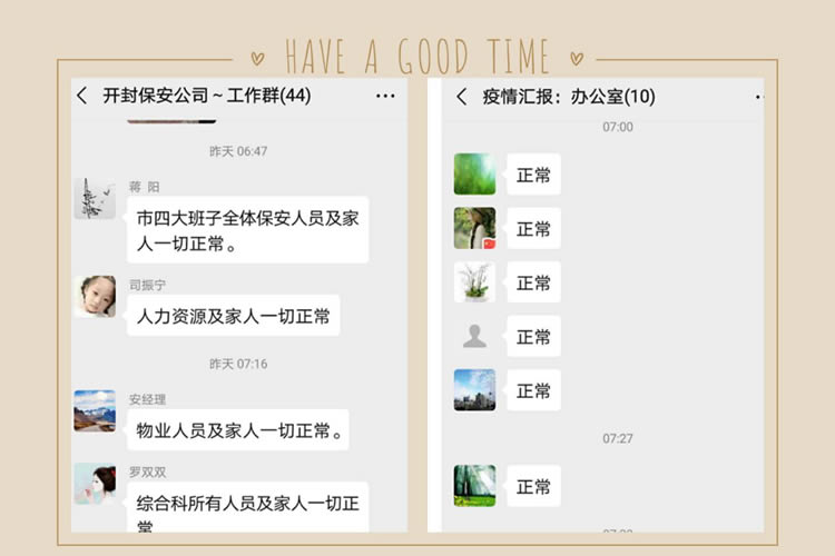 1、加強(qiáng)安全管理責(zé)任。切實履行職責(zé)使命,全員排查并填報《開封市保安服務(wù)有限公司在職職工新型冠狀病毒感染肺炎疫情防控排查表》,及時掌握在職職工、配偶、子女及其親戚的健康狀況。建立每日報告制度、24小時值班制度、登記制度、信息上報等,全力做好疫情防控工作。