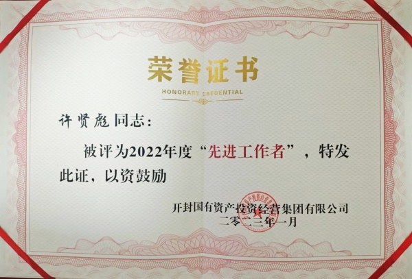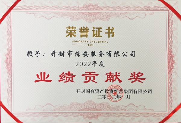 2023年1月16日,在開(kāi)封國(guó)投集團(tuán)召開(kāi)的2022年度年終總結(jié)暨表彰大會(huì)中,開(kāi)封市保安服務(wù)有限公司榮獲“2022年度業(yè)績(jī)貢獻(xiàn)獎(jiǎng)”,公司員工許賢彪同志榮獲“2022年度**工作者”稱號(hào)。